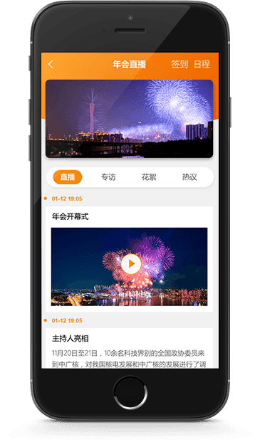 此次企业号开发栏目主要为直播、专访、花絮、热议和日程。直播栏目为年会开展时的各项主要事项视频播放,便于员工可随时看到年会的实时要点要闻。专访和花絮为年会开展过程中的视频或文章的访谈等,员工还能从这两个栏目看到自己为年会所准备的惊喜视频,增强年会的粘度。热议是提供年会的各个热议话题,让员工在此应用平台有一个沟通的窗口,对公司的发展和年会的开展可以提供自己良好的建议。同时,还能在日程实时查看年会的各项日程安排,了解年会动态。