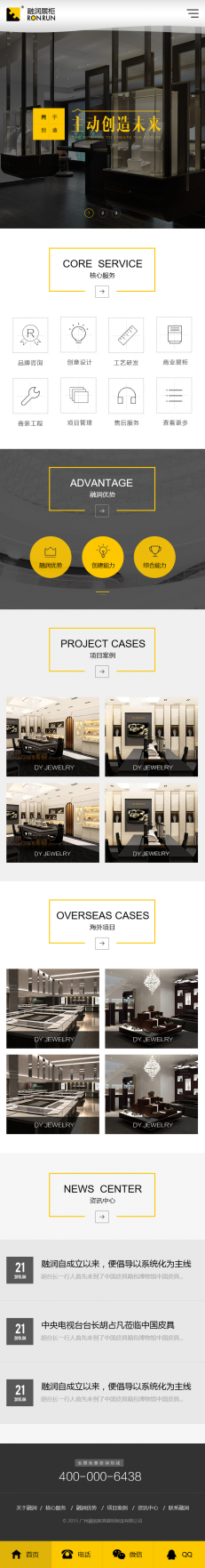 网页设计符合奢侈高端感,黄色和黑色的运用协调,并且黄色很好地避开了土黄感,为版面起了润色作用。 Banner 采用融润logo 延伸的图形设计,通透的黑色提升档次。在内容区的设计上,如核心服务多用线来绘画图标,使版面在线条上的运用更加统一,并且符合融润展柜本身也是设计行业的特质。