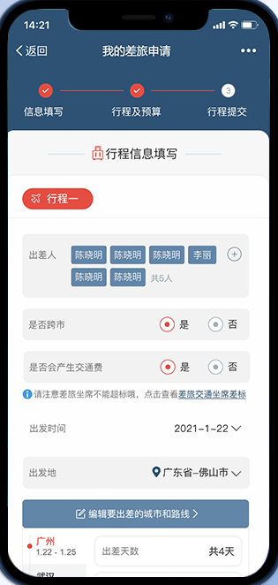 首页页面分成4个部分来进行区分,涵盖了出差类型、出差人、出差日期、出差预算,集差旅申请、差旅报销内容为一体,更加的快捷、方便、高效。各个流程结构顺畅合理,让内部人员的使用体验感高。