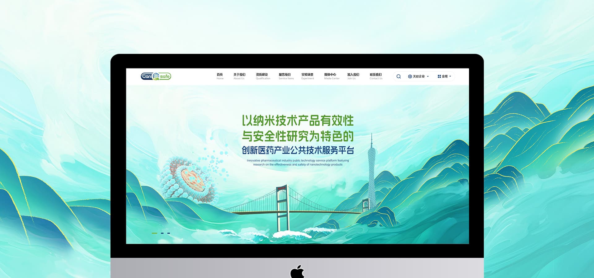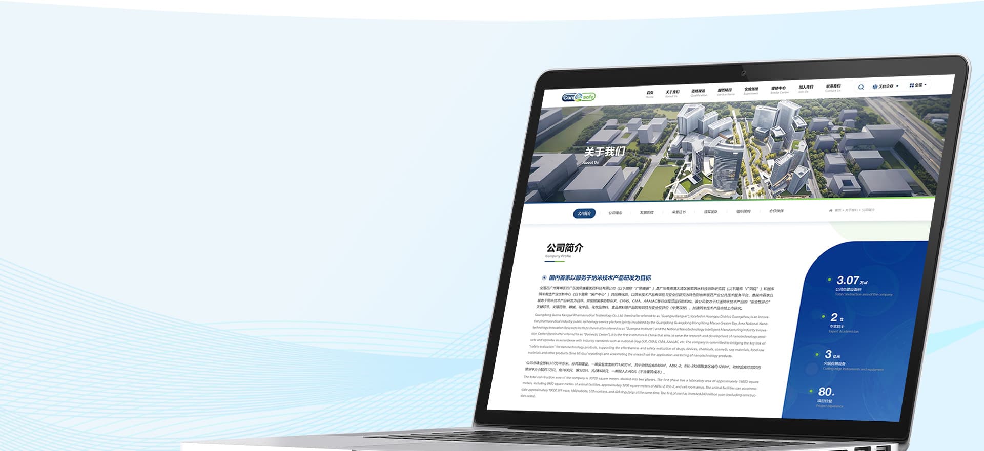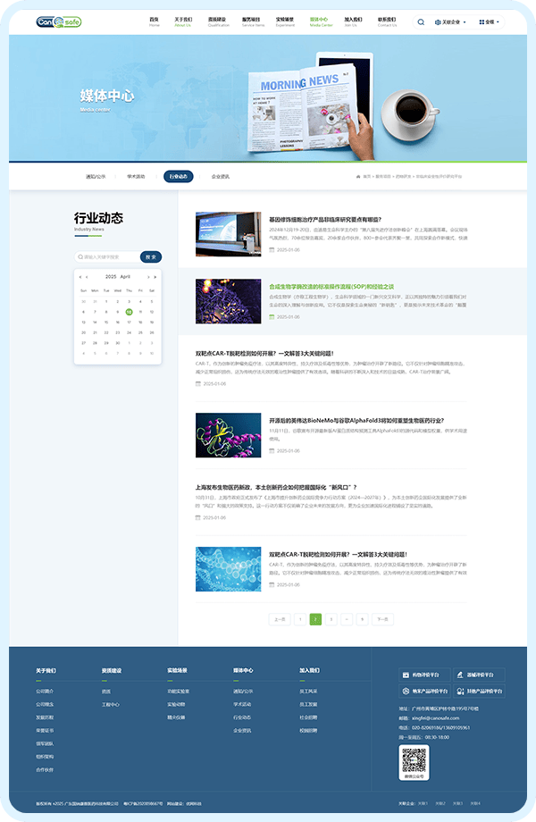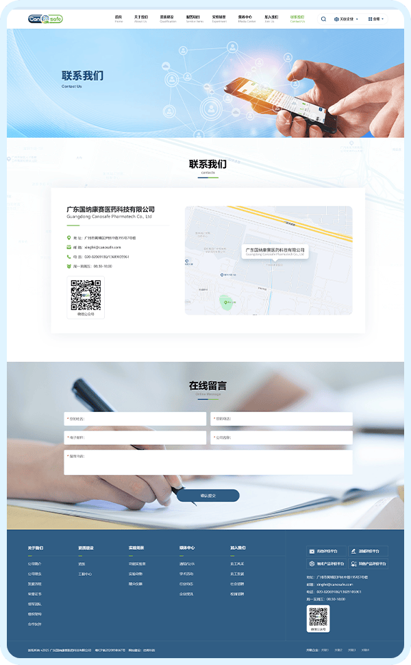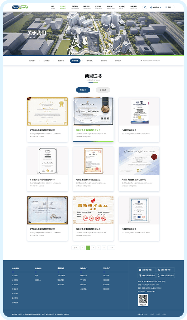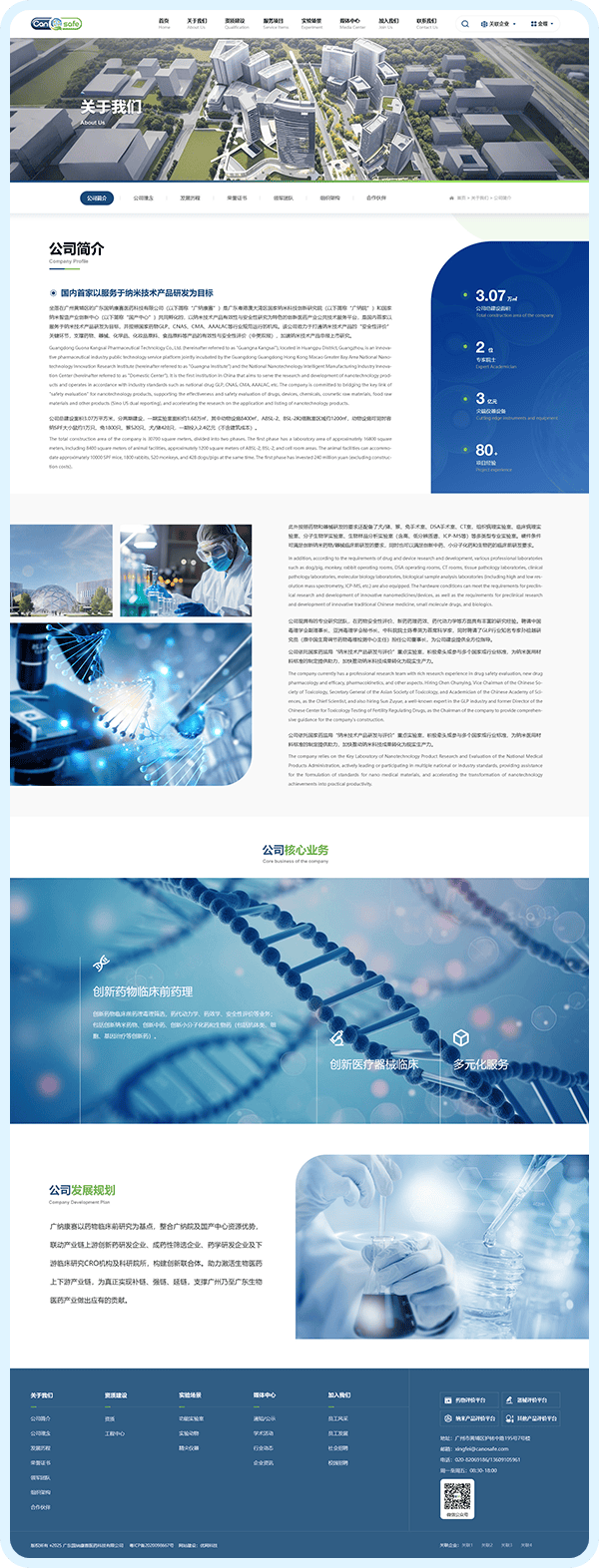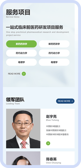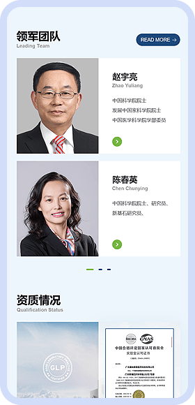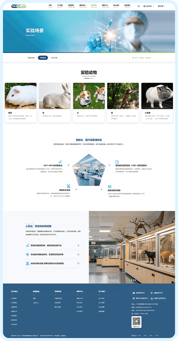 1、核心信息前置功能,10 秒明确定位:将 “资质情况”“服务项目” 两大关键板块置于首页前半区,客户无需滚动浏览,10 秒内即可明确广纳康赛的业务范围;通过层级优化,实现 “3 次点击触达核心内容”—— 点击 “服务项目” 即可展开非临床药效学、器械安全性评价等细分服务,点击 “资质建设” 可直接查看国家 CMA 认证、CNAS 认可等权威资质,信息获取效率提升 60%。