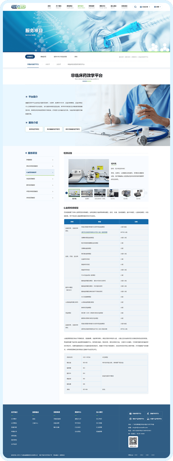 2、服务细分功能,精准匹配客户需求:针对广纳康赛的业务场景,将 “服务项目” 板块细化为 “药物研发”“器械研发”“服务外包与检验检测”“其他” 四大模块,每个模块下再拆解 “非临床药效学平台”“医疗器械临床前安全性及有效性评价”“化妆品安全性和功效评价” 等具体服务,无论是药企、器械公司,还是食品、消毒产品企业,都能快速找到适配服务,避免需求错配,客户精准匹配率显著提升。