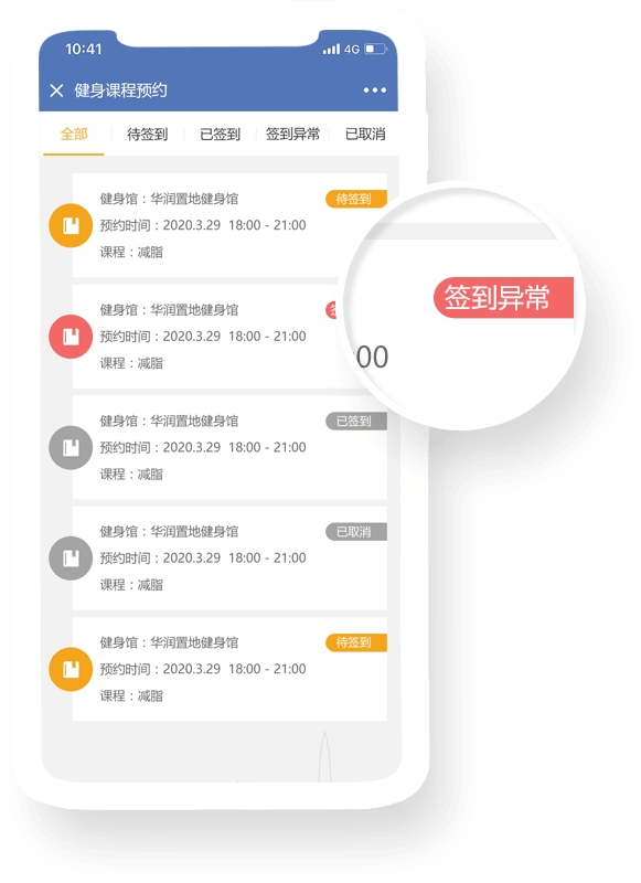 每一项的预约记录都分了不同的状态,主要是包含了待签到、已签到、签到异常、已取消,为每一位员工提供更准确的参与记录。
