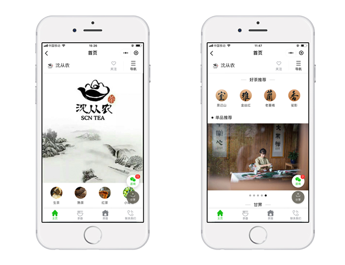 沈从农小程序开发的页面设计结合了中国水墨画的元素作为背景,与茶叶生长的环境相契合,凸显出茶叶特色;图标的选用和设计上融入了毛笔字,浓浓的中国元素体现出沈从农茶叶的高雅与腔调,图标结合不同类型茶叶图片等前端交互设计,增加了交互的趣味性以及引导性,符合沈从农推广茶文化的初衷。