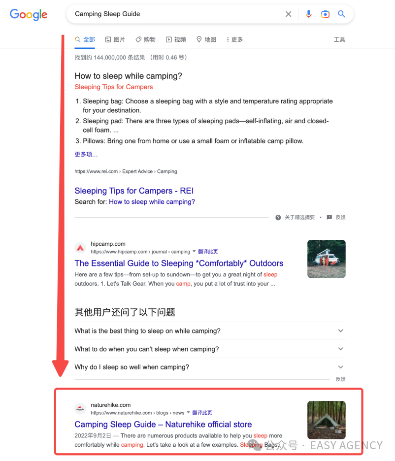 以关键词“Camping Gear Guide”为例,Naturehike在搜索结果中的排名处于领先位置。在其博客内容中,品牌通过内链将产品与文章深度关联,增强了网站内链的优化效果。这不仅提高了消费者的购买转化率,还增强了品牌在露营装备领域的专业形象。