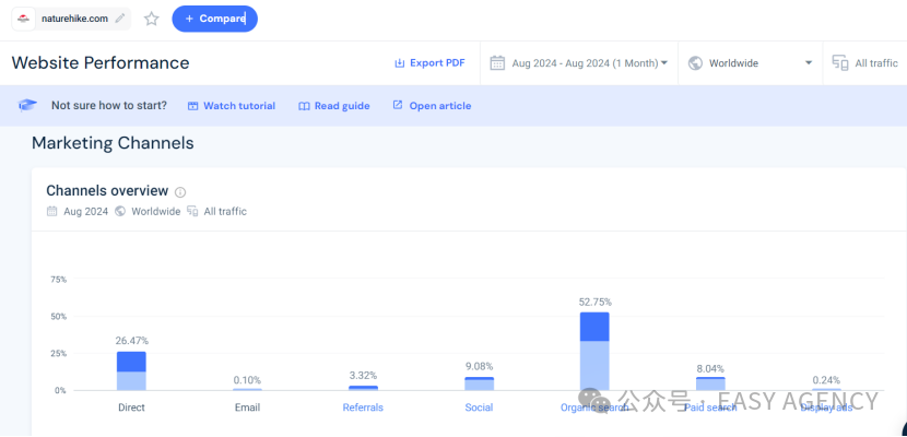 根据SimilarWeb的数据,2024年8月,Naturehike的独立站流量来源中,有52.75%来自有机搜索,26.47%来自直接流量,显示其谷歌SEO策略的显著效果。通过有效的谷歌SEO优化,Naturehike显著提升了在相关关键词上的排名,成功获取了大量自然流量。这得益于品牌在内容营销方面的精细布局,精准捕捉并满足了用户的搜索需求。