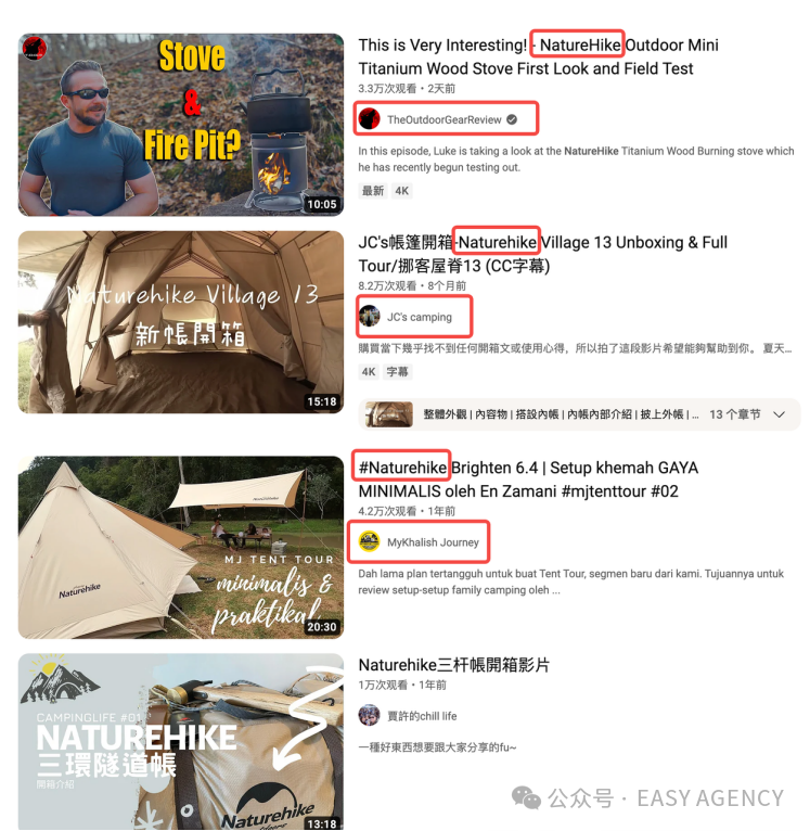 不同于传统的社交媒体营销,Naturehike的策略重点并非单纯追求粉丝增长,而是通过与垂直领域网红的合作,实现精准的内容投放。例如,在YouTube平台上,Naturehike通过与露营相关的网红合作,发布展示产品核心功能的视频,如“30秒快速搭建帐篷”,有效吸引了新手露营爱好者,助力品牌拓展细分市场。
