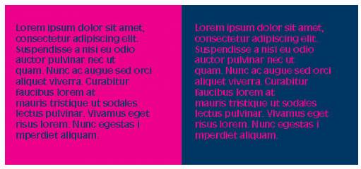 有些色彩组合只适合运用在前景色的部分,而不适合做背景色。比如深蓝色的文字搭配粉红色的背景与粉红色的文字搭配深蓝色的背景,都是使用两种一样的颜色,但用在不同的部分则影响了它的可读性和阅读的舒适度。重要的是,不仅要使用良好的色彩组合,而且要把它用在页面中的合适元素上。