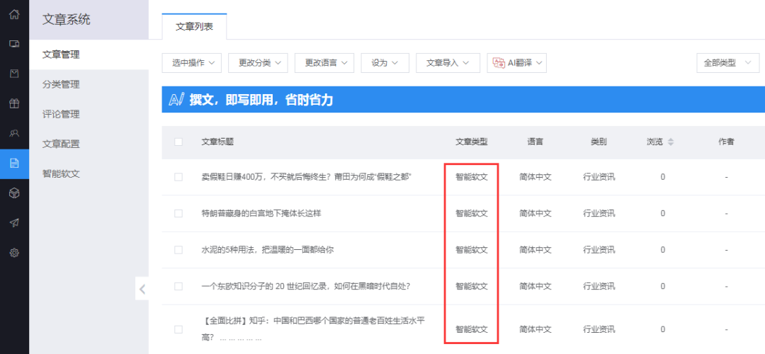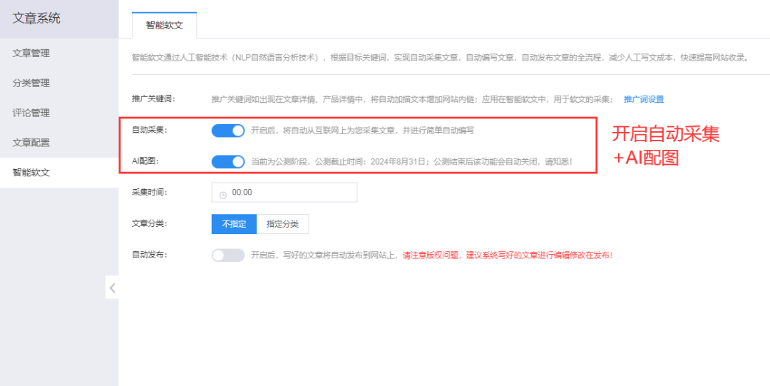 作为专业的建站系统,上线至今,一直不断迭代更新,为众多中小企业提供建站服务。策划设计,技术支持,售后服务,省心方便。同时也是为客户提供精准营销服务、是优选的战略合作伙伴。以前,当我们在文章系统中开启【智能软文】后,系统会自动从互联网上采集文章并且进行编辑,但是部分文章采集回来后,没有匹配图片,导致文章收录效果不太理想。可以让AI帮您写出图文结合的原创文章,提高搜索引擎排名,让潜在客户通过网站找到您,产生业务联系。1. 首先进入在建系统,在文章管理的智能软文位置,开启【AI配图】