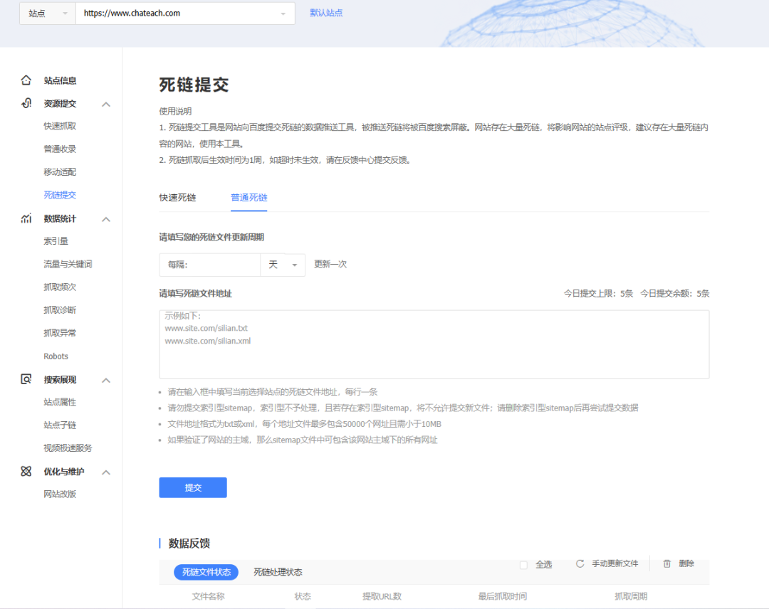 普通死链:文件地址格式为txt或xml,每个地址文件最多包含50000个网址且需小于10MB;不支持索引型sitemap;文件中只可包含该网站主域下的网址。在提交的时候选择正确的更新周期,取决于站点提交的死链文件的更新周期。如果只是偶尔提交死链,一定把抓取周期填久点,并且如上图所示的死链处理状态状态显示已删除之后之后及时删除提交的该条死链文件,避免重复无效的抓取。