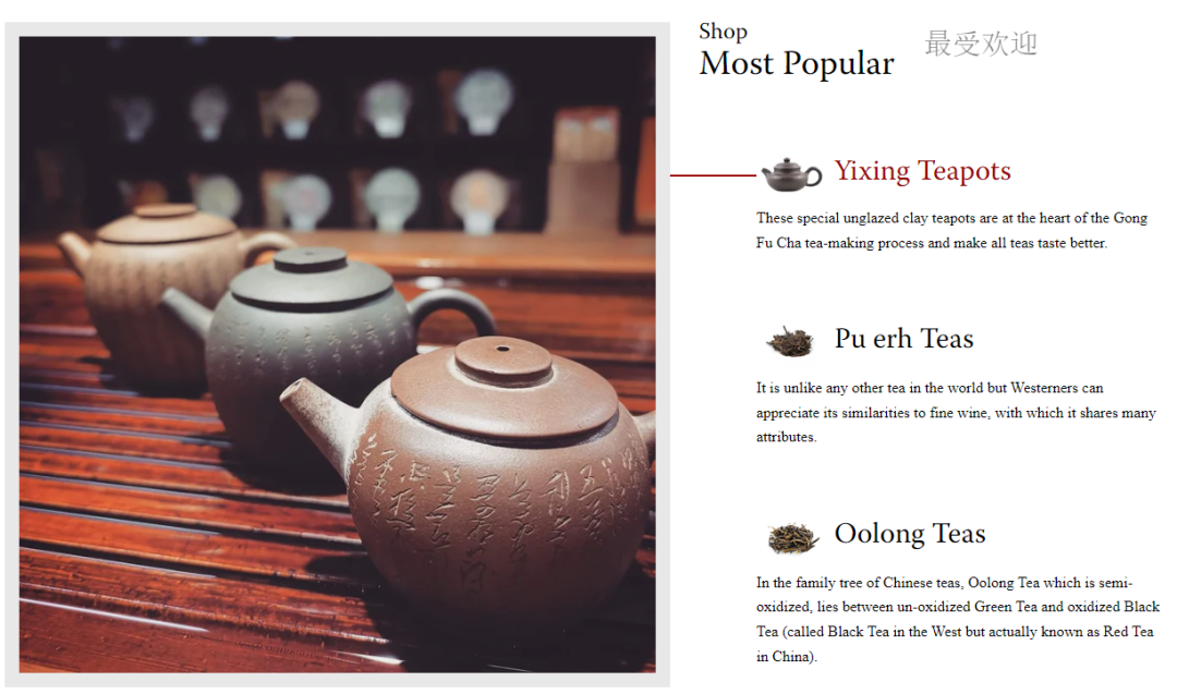 茶叶是一个相对比较垂直的品类,想要脱颖而出快速变现,需要打造自己的特色。除了茶叶以外,也可以上架与之配套的茶壶茶具,甚至中式服装、小摆件等,打造出自己的产品定位和品牌调性。通过独立站模式,传统茶叶更容易上架,卖家可以充分利用独立站优势,进行品牌营销。以这家The Chinese Tea Shop独立站为例,网站主要产品为茶叶和宜兴茶壶。