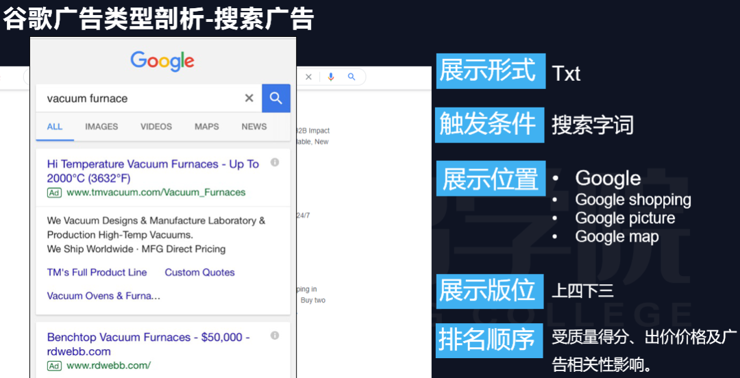 卖家可根据Facebook后台提供的用户定位,包括地区、年龄、性别、兴趣爱好、行为特征、家庭情况等,亦可对用户的设备进行分类选择。 Google为全球市场份额最大的搜索引擎,占比93.96%,全球访问量最大,月访问量达到880亿次。利用Google广告进行引流是基于Google广告系统提供用户定位,定向投放。Google广告包括搜索广告、购物广告、展示广告以及视频广告。此次重点介绍了常用的搜索广告、购物广告。 搜索广告通过搜索字词定位,展示形式为Txt,排名顺序的话也是受质量得分、出价价格及广告相关性影响。