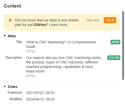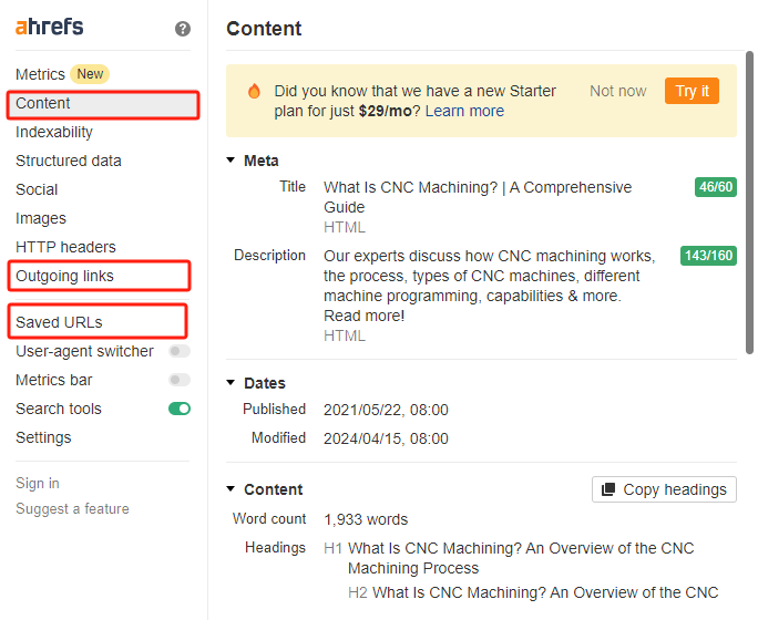 Content功能:顾名思义就是对页面内容进行分析,也就是常见的TDK,目录、字数等等,同时这里也有可以看到网页的初次发布日期和修改日期,让你更加了解竞争对手页面的更新状况!