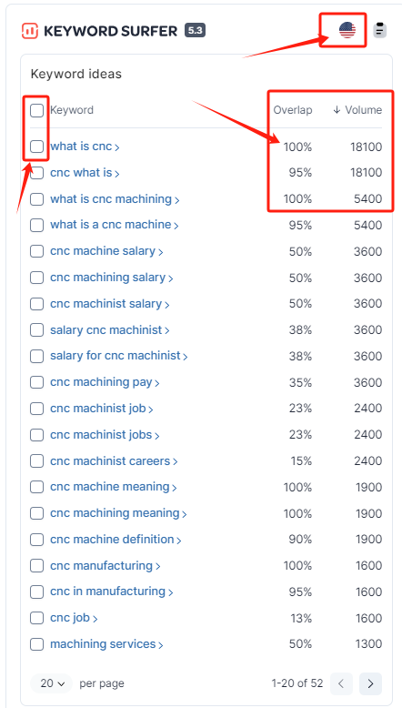 Keyword Surfer这个工具和之前的关键词工具略有不同的地方是:1、UI设计比较简洁 2、支持勾选关键词功能 3、提供了实时的搜索量数据(免费版也提供)4、实时查看相同关键词在不同国家的搜索数据