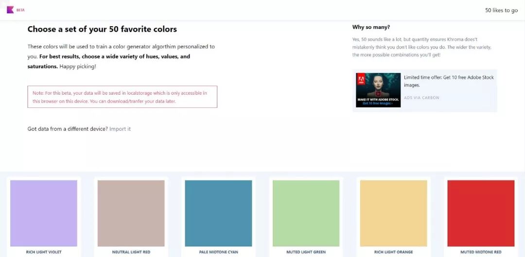 进入网站,点击首页的个性化按钮即可进入颜色选择界面,在这里你需要选择你喜欢的50种颜色。网站提供了上千种颜色,需要自己心仪的颜色点击即可。颜色尽量挑满50种且丰富一些。