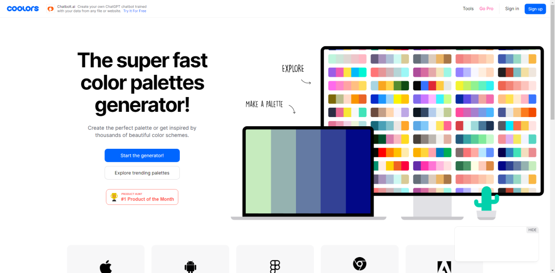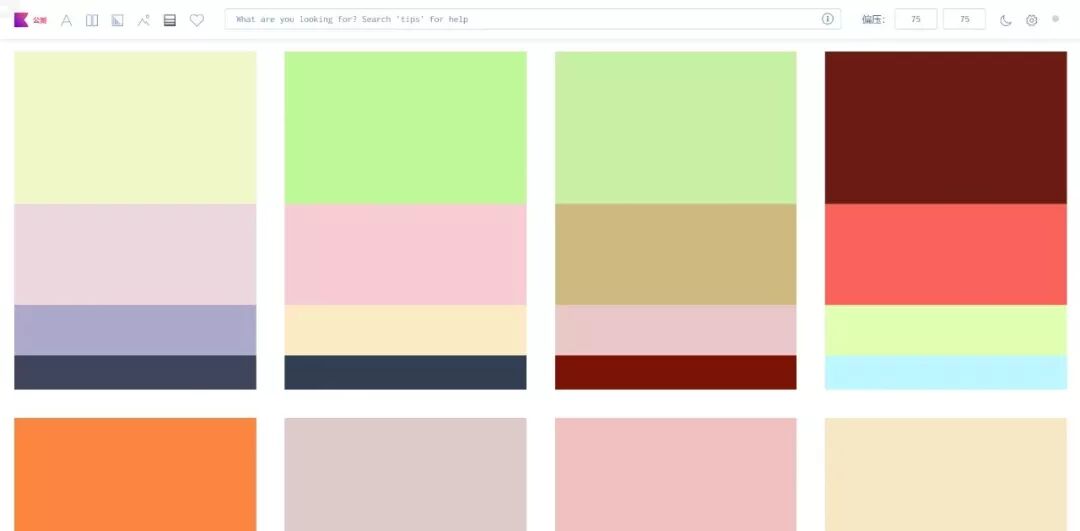 在线快速配色方案生成器,Coolors主要提供Generate和Explore2类功能服务。会随机产生一套包括五种颜色的方案,并展示它们的色彩参数与代码。我们可以对其中任意一种颜色单独进行,色调饱和度、亮度等选项的调整,也可直接修改其参数,它支持使用颜色、主题、样式及十六进制值进行搜索,点击颜色就能复制到剪切板,这一点非常nice!