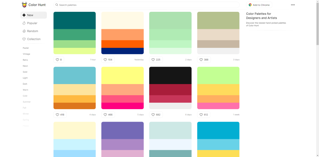 这是个十分直接的网站,最大的特点就是提供了很多现成的配色方案,数量也非常多,对配色小白很友好,简单易上手。你只需要浏览并选择你喜欢的配色即可。