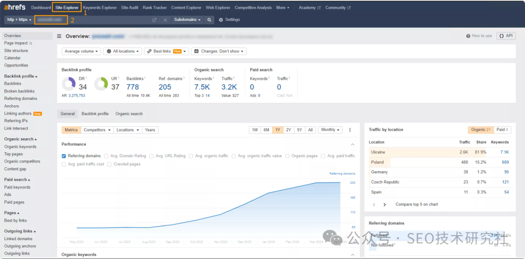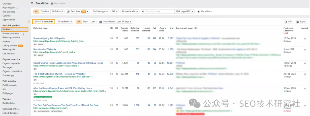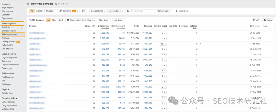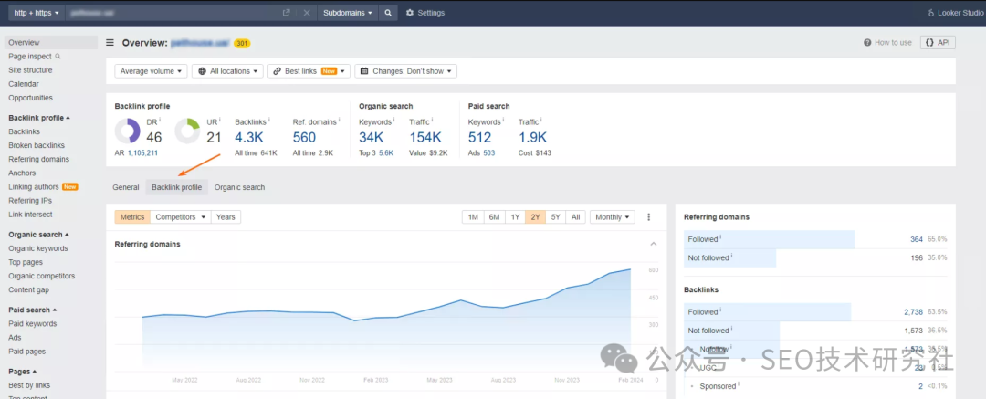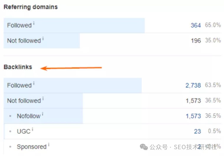在研究竞争对手网站的反向链接时,请考虑 dofollow 和 nofollow 链接的比例。搜索引擎机器人会考虑 Dofollow 链接,并将其视为本网站不反对将其部分权重/权限转移给另一个网站的信号。这种类型的链接对于网站所有者来说总是更可取。但是进行放置的网站并不总是有机会和/或希望放置带有 dofollow 属性的链接。Nofollow 链接对搜索引擎的含义正好相反:该网站不想宣布另一个人的权威并赋予他权重。在Google 帮助还建议标记带有赞助属性的链接 — 对于那些收费的链接。Ugc (用户生成的内容) — 用户自行在网站上留下的链接,例如,在评论中。在购买链接的情况下,设置 dofollow 属性是可能的,也是可取的,尽管 Google 不建议这样做。dofollow 和 nofollow 链接没有完美的比例。但建议将大约 70-80% 用于 dofollow,将 20-30% 用于 nofollow。此比率被定位为自然。并非所有网站都愿意发布 dofollow 链接,并且通常也存在 nofollow 链接。如果网站的链接配置文件不适合指定的框架或仅包含 dofollow 链接,这并不意味着搜索引擎会做出负面反应并悲观(降低)位置。该比率可能因利基市场、地区和促销策略而异。你也可以在 Ahrefs 的 “Overwiew” 选项卡下找到分析所需的数据。