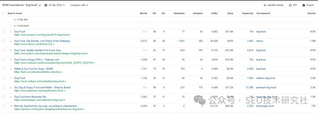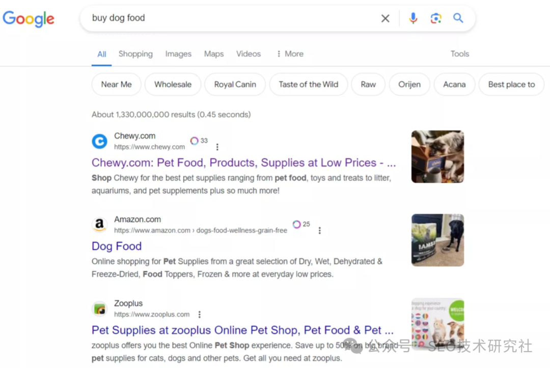 例:您有一家小型宠物店,主要类别是“狗粮”。如果检查主商业查询的结果,则可以获得以下结果: