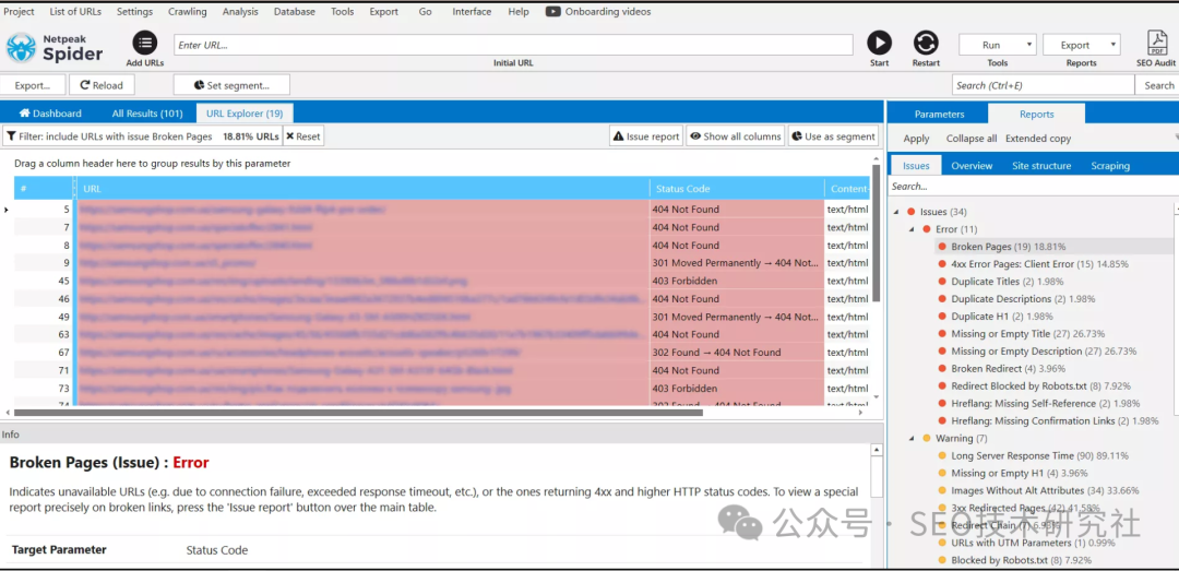 借助 Netpeak Spider 多功能工具,您可以确定竞争对手的哪些登录页面无法正常工作或不存在 (查找失效链接的指南),您将获得以下结果。
