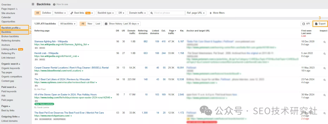 一种可能的策略是搜索失效的链接 — 导致竞争对手网站已删除/不存在的页面的反向链接。您需要找到反向链接指向的竞争对手的登录页面,并检查这些页面之间是否有错误或删除的页面。转到 Ahrefs,转到 “Backlink Profile” - “Backlinks” 部分,然后下载报告。