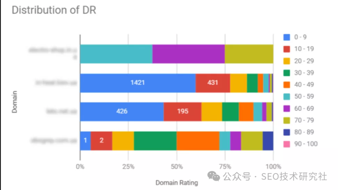 在分析竞争对手的链接概况时,首先要注意 Domain Raiting。DR 是根据其反向链接评估网站权重的指标。最好超过 30。原则在这里适用:越多越好。在 Ahrefs 的 “Overwiev” 选项卡中,在链接类型比率表下,你可以通过选择 “By DR” 选项来找到你需要的数据。