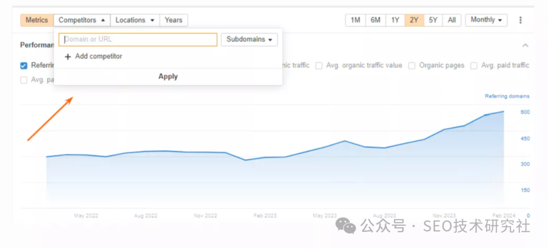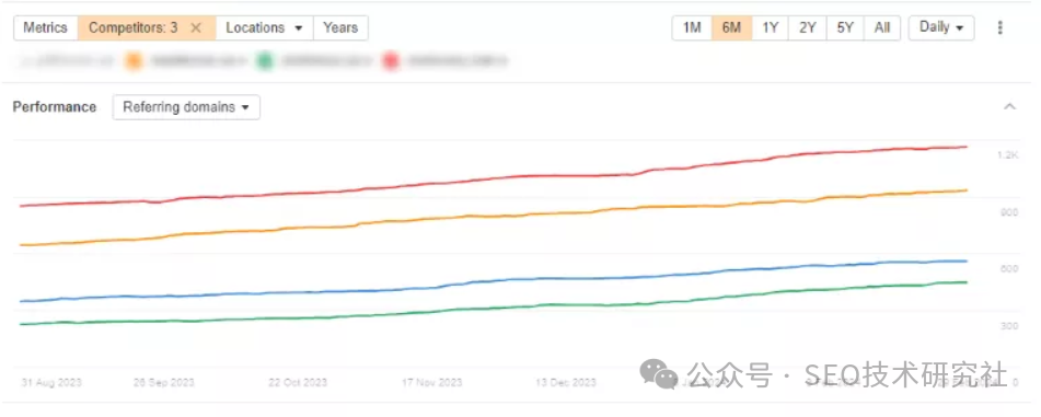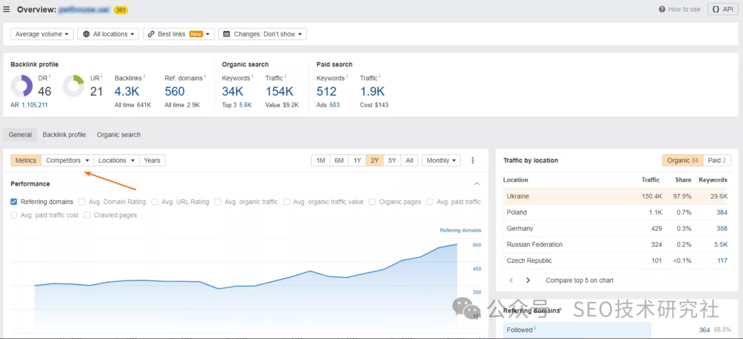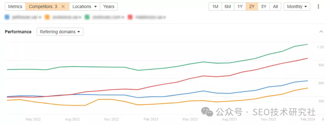 在分析竞争对手的反向链接时,你应该注意的第一件事是引用域数量变化的动态。每个月,它应该是平稳和恒定的。搜索引擎链接质量的这种增加被认为是自然的,您不会因为链接的不自然增加而冒着失去在搜索结果中的位置的风险。对于一些网站来说,外链数量的急剧跳跃是很自然的,因为它们与新闻突发事件有关。例如,一个新闻频道发布了一个轰动。或者由于期待已久的智能手机型号的发布,指向该品牌网站或首批交付的在线商店的链接可能会急剧增加。还要注意竞争对手的环节质量发展的强度。如果速度比你的快得多,同时他们的动态曲线显示出平稳和渐进的增长,你应该加快你的网站向这个方向移动。要查看这种动态,请前往 Ahrefs。在第一个 “Overview” 选项卡上,您将看到一个为您的域构建的图表。请注意,图表的源数据可能会发生变化。您需要选择您感兴趣的参数:引用域的数量、域评级、自然/付费流量或更多。要将您网站的图表与竞争对手的图表进行比较,您将需要 “竞争对手” 下拉列表。