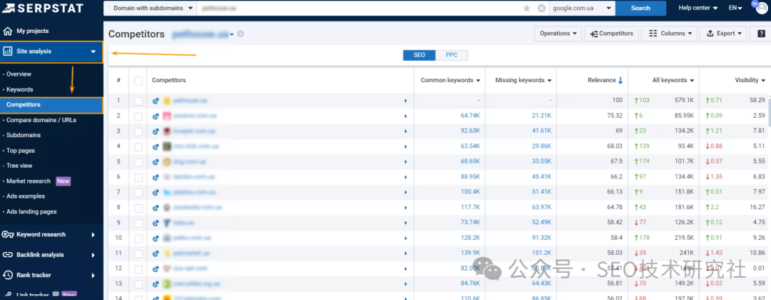 转到 “Site analysis” 部分,即 “Competitors” 子部分。