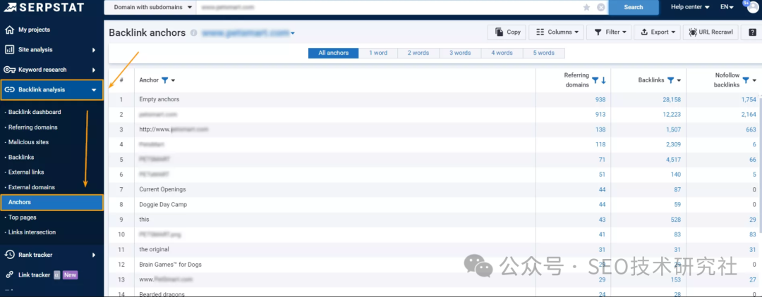这个比率是近似值,可能会因网站的特点、利基市场和其他条件而异。要获取你的网站和竞争网站的锚点列表,你可以使用 Serpstat 或 Ahrefs 服务。在 Serpstat 中,您将需要 “Backlink Analysis” 工具及其 “Anchors” 报告。