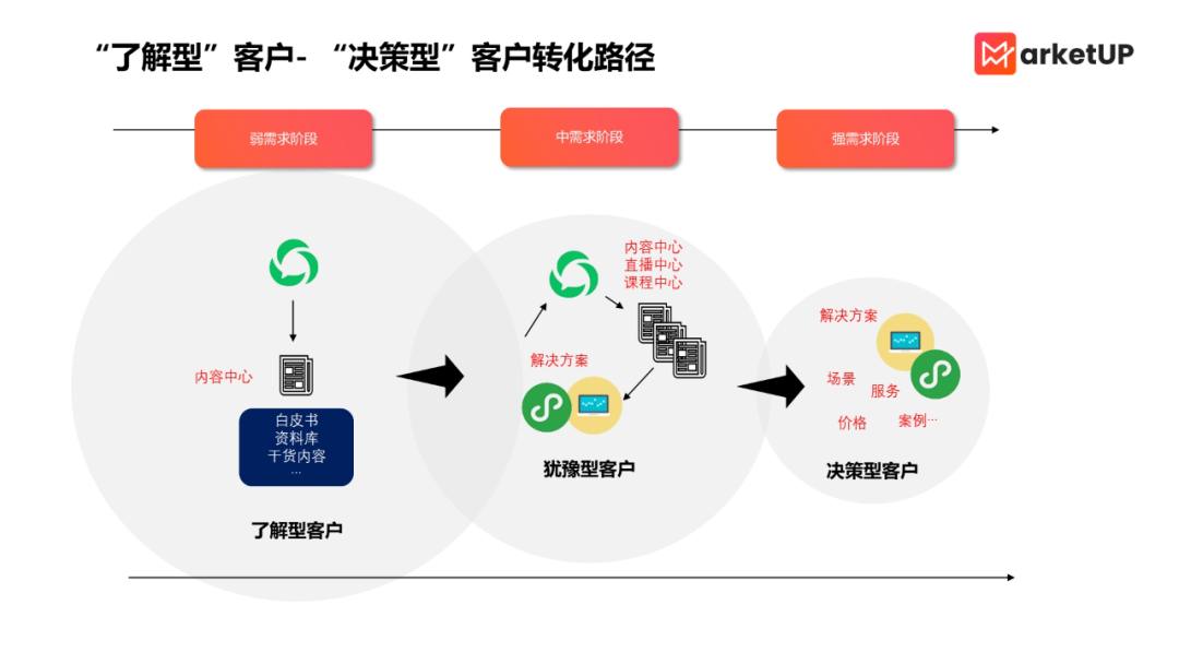 有构建不成,还得实际上去运营。这里涉及到很多规则,因为在MarketUP的已付费企业用户中,有不少都会问道我们如何基于场景构建营销路径 。也就是说,虽然以上的设施也许多少大家都是具备的,暂不说是否可以贯穿统一,不漏掉线索动态。但至少,这里必须让客户能够“流动”起来的运营链路。而不是进线就丢失。A、了解型客户 / 知识普及型客户/ 弱需求客户 (不知道自己需不需要)B、犹豫型客户/ 知识挖掘型客户/ 中需求客户 (知道自己需要,但不知道具体要什么或怎么做)C、决策型客户/ 精准认知型客户/ 强需求客户 (非常清楚知道自己要什么)其实私域的绝大部分作用,是将A转为B,再转为C。市场挖掘到一个强需求的客户,代价是很高的,这就倒逼企业,需要将弱需求、中需求的客户重新重视起来。往往A- -C能够带来更大变动机会的企业,在市场才能赢得更大声量。(线上直观互动营销 ,做好认知品牌、认知产品、认知团队作用)