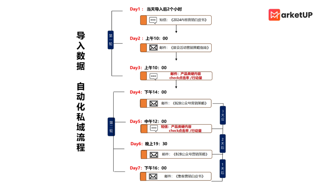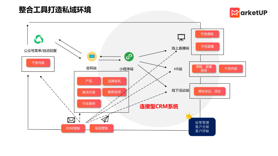 ToC企业一直都有私域运营的概念,客户量级大,效果明显。因而市场上各样的私域产品令郎满目,私域运营方式也五花八门。ToB企业对“私域”显得就有些陌生。可能会觉得这只是个C端概念,拿到B2B企业并不实用。殊不知,B2B企业更应该讲究“私域”运作。比起C端企业的客户获客容易、转化链路短而言,ToB企业几乎获取一个客户都要费九牛二虎之力,并且还得是符合客户画像的精准客户,可想而知的宝贵。当然除此以外,整体来说,B2B企业的客户孵化周期更长,不像C端的决策链直接,也短。ToB企业往往也经历咨询- 选型的过程,短则一个月,长则甚至一年的时间,如果在这个周期内,客户因为大量接触供应商,忘记了你,该如何。所以ToB企业的“私域”首先是重要的,其次它的核心目的就是——不断在你面前出现,提醒你有这家企业可以建立合作。并且过程中不断展示自己的优势:专业优势、产品优势、服务优势等等。其实很多B2B企业是有做私域的认知的,但苦于不知道怎么做。错误的把私域当作私来处理了,“域”没创建起来 。工具很多,各种割裂,形成不了闭环链路,最后让线索死在了割裂的工具中。比如 :CRM (割裂)+ 公众号粉丝(割裂)+ 网站(割裂)+ 展会活动(割裂)...销售客户记录在CRM,运营内容加粉在公众号,通过网站进线的可能电话直接沟通了 ,展会的客户来了最多也是销售的潜客加到企微上了。——CRM的客户会被长期激活吗? 销售记得过往以来的每个意向客户吗?——公众号内的粉丝如果不点击文章或不再关注公众号,我们还有其他方式寻找到他们吗?——进线的电话,沟通完,除了再次电话或加上微信沟通,我们还有其他方式提供持续价值给他们吗?——展会活动结束后,这些客户还有办法多方触达到吗?以上如果没有一个“域”的概念,都很难完成。或者完成起来比较混乱。微信公众号端 - 官网端 - 小程序端 - H5端 - 线上直播端 - 线下活动端这意味着不论你的营销阵地在哪里 ,客户其实都是可以随着阵地的变化而转换场景,但同时不失去行动轨迹的追溯这意味获取用户的线索可被追踪,市场部的工作可被量化 ,在获客层面重投入到哪里,甩开那些不必要的工作,都是基于此来进行衡量的。除了正常记录客户信息和分类管理客户之外,对于以上多营销端口的体现、渠道入口的区分体现、以及系统评分、甚至触发自动化管理,都得有贡献。它应当是业务驱动型的,可以帮助企业自主孵化管理的CRM。比如EDM、短信。MarketUP的EDM送达率一直在80%以上,而打开率也一直都8%-12%之间,通过EDM带来有效客户可以视为目前B2B企业一种非常好用的激活方式。这一营运效能放在短信上甚至更好。