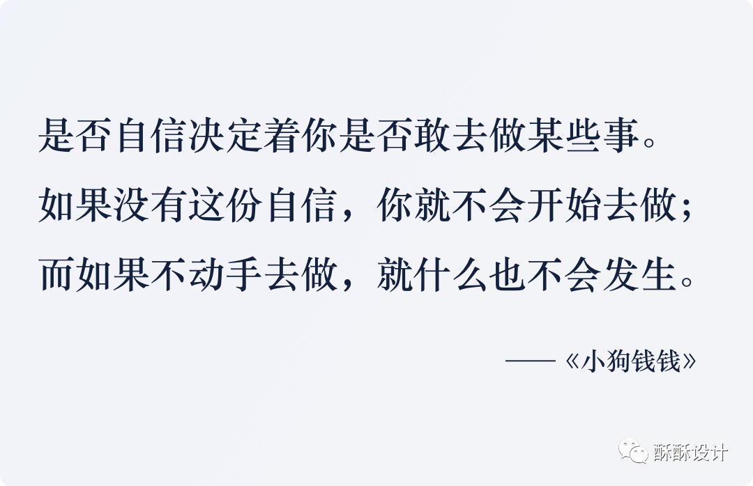 小狗钱钱解释道:“是否自信决定着你是否敢去做某些事。如果没有这份自信,你就不会开始去做;而如果不动手去做,就什么也不会发生。”