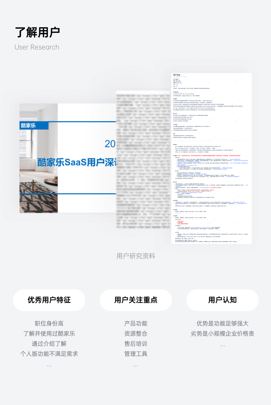设计主管or专业负责人:关注产品功能,学习成本、管理能力,也关注产品公司的品牌实力情况。小微企业负责人或个体老板:关注产品功能、学习成本、售后培训,让不是专业设计师的员工快速学习并使用,帮助销售业绩的上涨。通过用户研究,我们了解到是什么因素影响了用户转化,借此可以更好的组织信息构建。