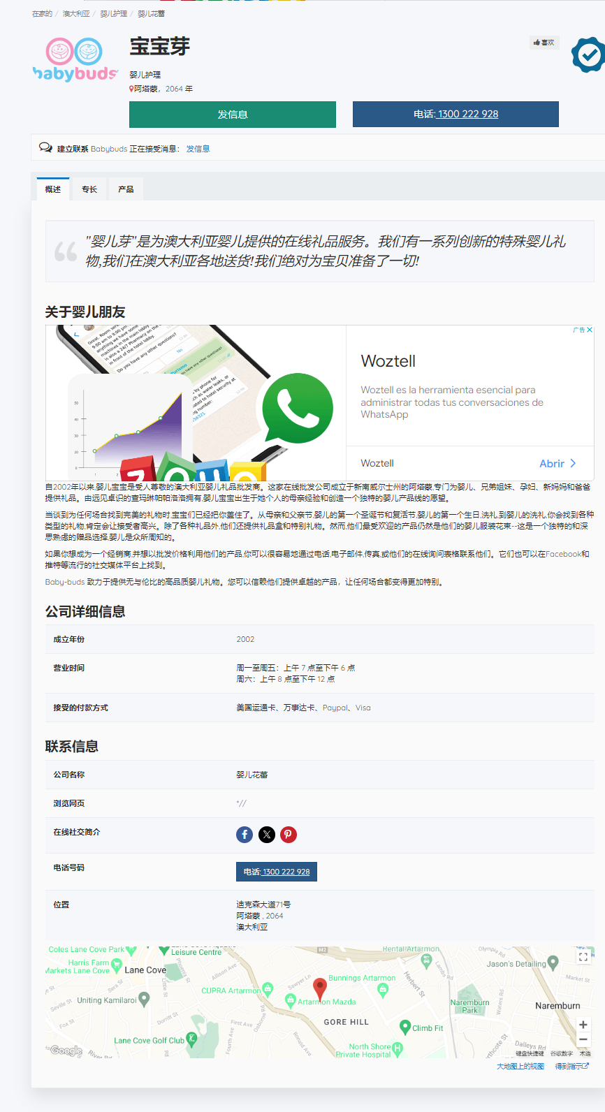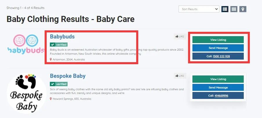 www.wholesaledirectory.com.au澳大利亚本土的批发商企业查询网站,行业多,信息全,如图:比如做婴儿服饰,可以直接搜Baby Clothing,可以查询到澳洲的相关公司,点击查询有公司概述,网址,电话,公司详细信息,成立时间,社媒账号和具体位置