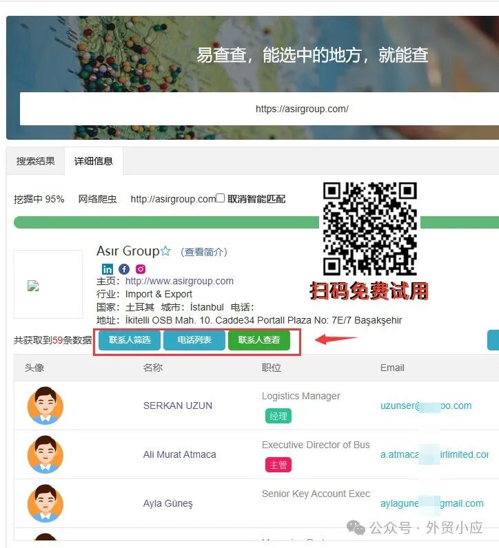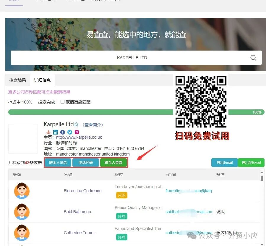 如果想要找更多客户的联系方式,还可以结合易查查爬虫工具深挖找公司职位邮箱以及采购负责人 邮箱电话,如图: