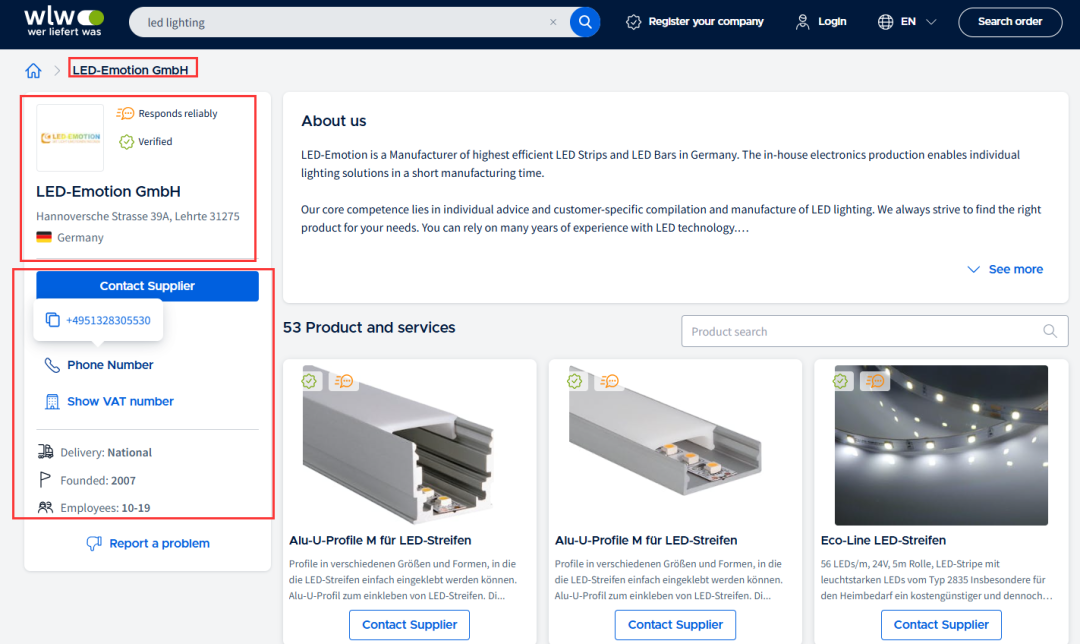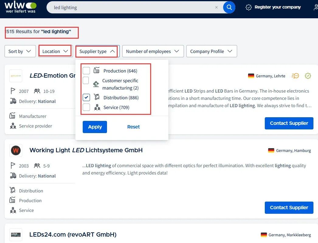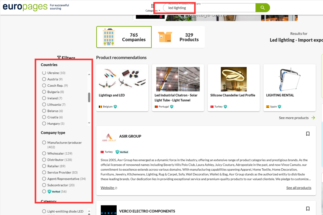 欧洲知名的B2B平台,覆盖超180国家,300万+公司信息,涵供应商、制造商和分销商,支持26个语种搜搜索框中输入产品,迅速匹配相关企业,左边可以筛选国家和公司类型