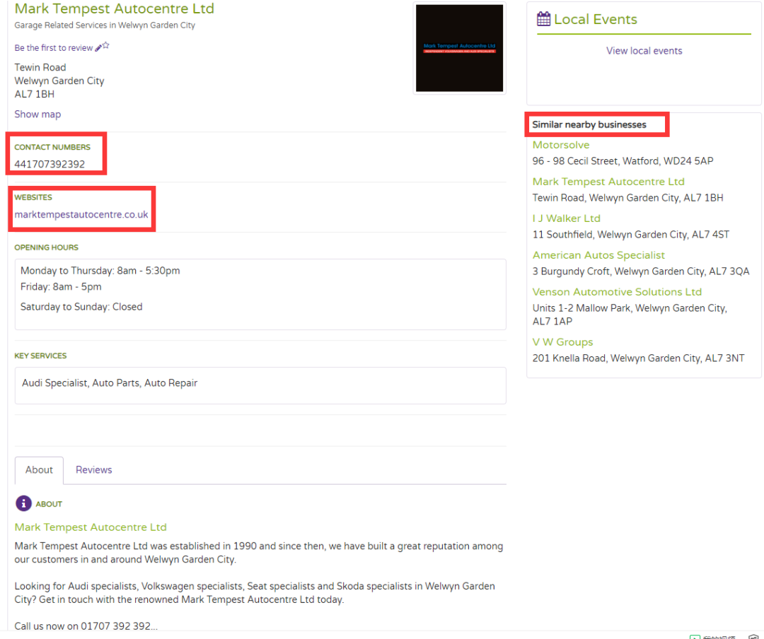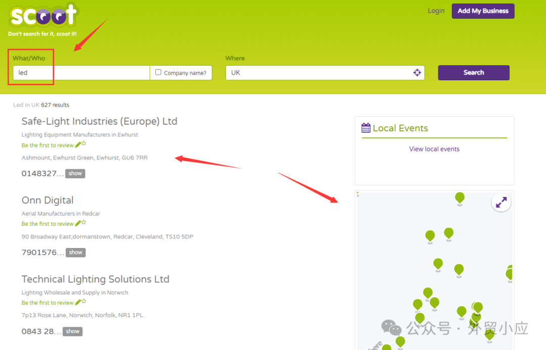 网站 https://www.scoot.co.uk/英国b2b平台,适合开发英国本土企业,直接分行业查询当地企业信息,比如led,可以搜索到英国有匹配的627家企业,右边是公司对应的地址位置