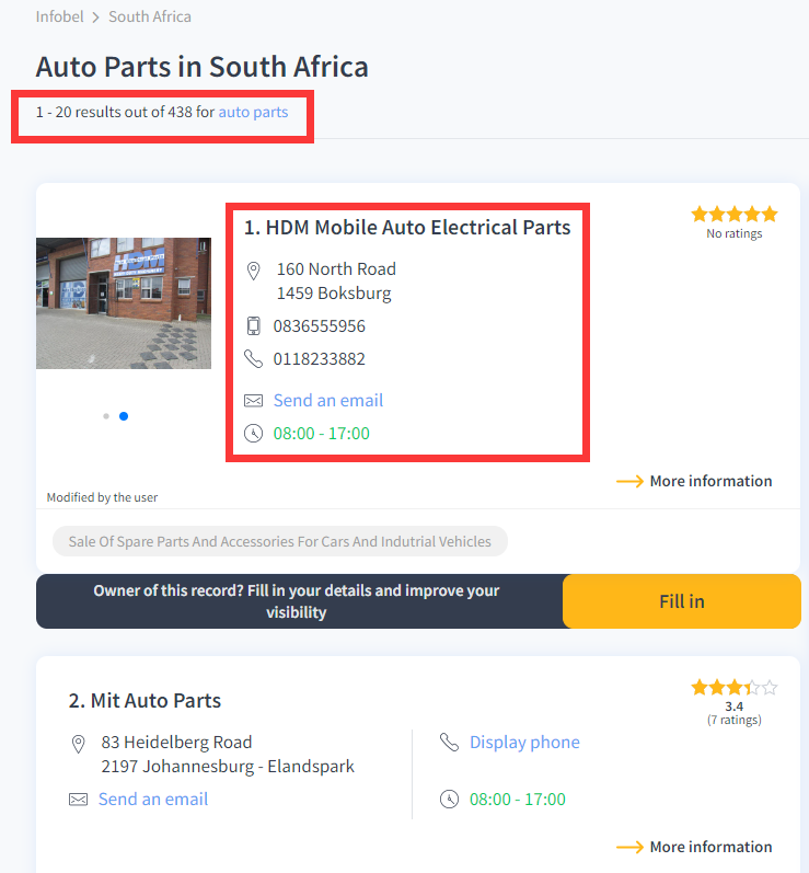 全球企业名录网站,包含73国超1亿买家企业名录,可根据服务商,企业行业搜比如开发南非汽配客户,可搜索auto parts,直接查询到买家的网站电话,地址,以及社媒账号
