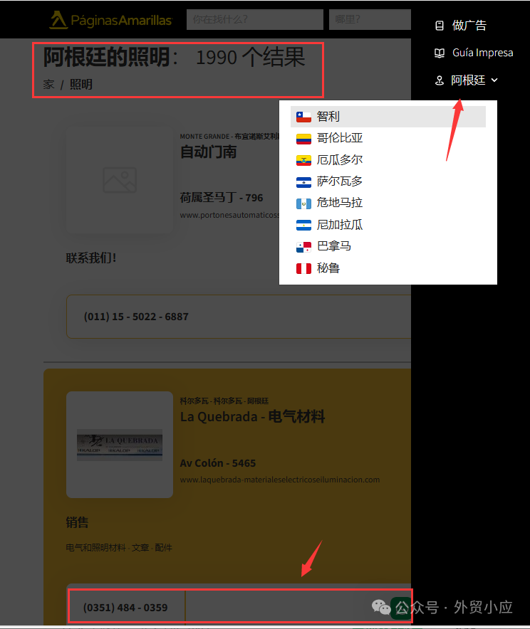 网址:www.paginasamarillas.com分享一个拉丁美洲的本地企业名录网站,覆盖阿根廷,智利,哥伦比亚,巴拿马,秘鲁,厄瓜多尔等国,西班牙语,可以网页直译,但是关键词建议翻译西班牙语后再搜精准度会更高比如你想开发阿根廷的灯饰客户,记得右边提前设置国家后,再输入关键词查询