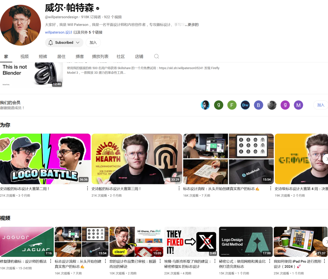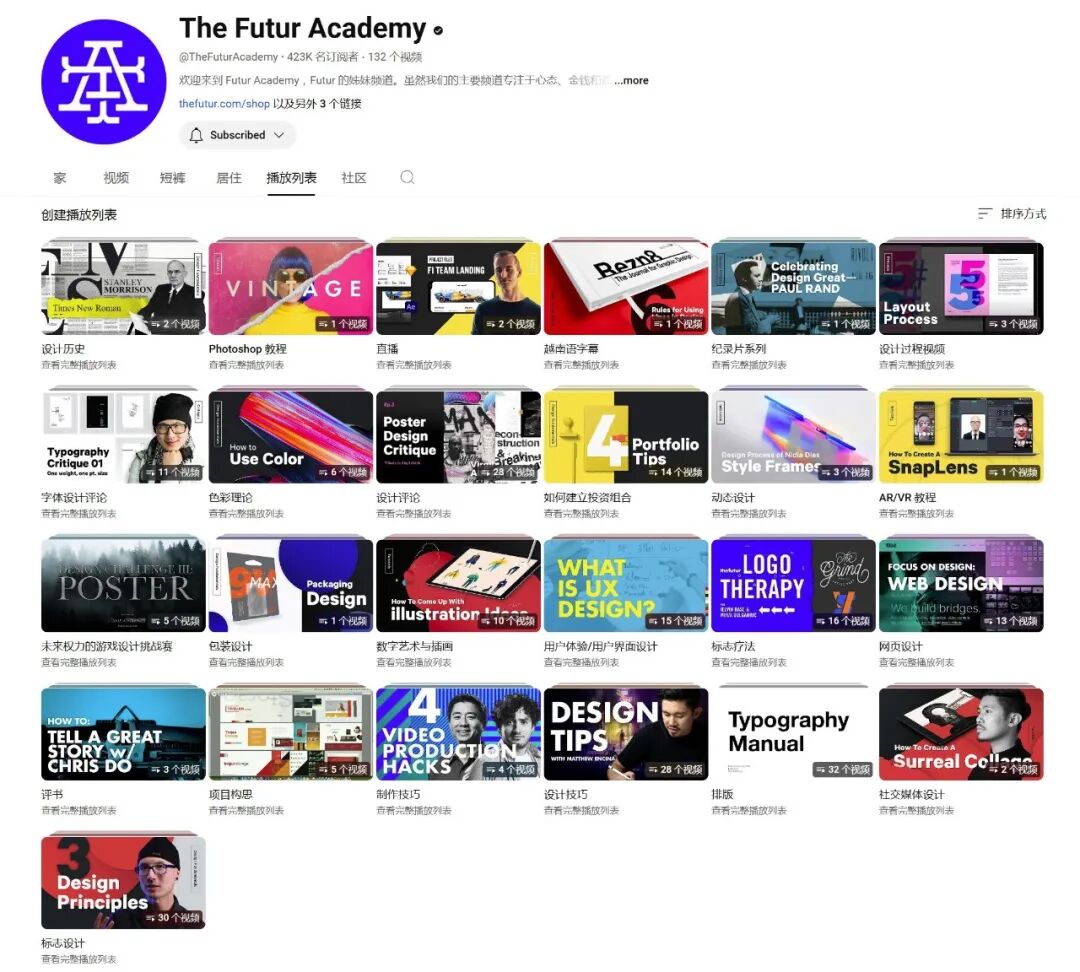 ① The Futur视频类型丰富、有大佬采访、品牌设计、版式设计、字体设计,还会分享各种赚钱的技巧。他们旗下还有一个专注分享设计的频道:“未来学院The Futur Academy”。