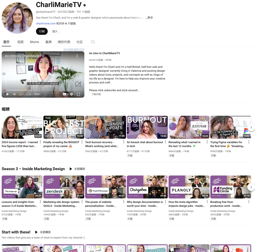 ② CharliMarieTV 一位来自新西兰的设计师,她的视频内容涵盖了UV/UX设计、品牌设计和工作流程管理。