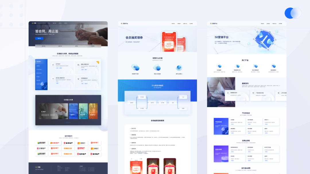 本多个需求同时跟进,项目多且杂从而产生超负荷。也不便于更好地理解业务。设计资源有限,设计完成后需要和不同业务线开发进行多次设计走查,影响设计师提效。针对b端产品,多样性设计无法形成品牌特性,传达品牌特色,导致中台业务线繁多但不“精致”官网设计中也有很多相似功能,面对繁多需求,设计者快速做出响应会产生重复劳动成本。只能做到满足功能,用户体验并不是很友好。通过总结之前的工作,发现很多设计内容有50%以上的重复率,我们要做的是将这50%重复率形成设计体系化,建立资源整合,搭建规范化官网模块,并把模块设计反推给产品,在提高设计效率的同时也减少产品工作,减少协同成本。通过“收集需求——整合归纳——定义组件——代码搭建“ 的过程提升设计效率。整合各个业务线资源,并根据业务系统进行分类:数据中台,技术中台,业务中台。面对这三大类别,目前官网需求量会达到几十个,而面这些繁多网站需求,首先要做的就是整合分类。Banner、产品优势、产品特色、案例、信息内容、信息流程、合作方、联系我们、关于我们、使用流程、功能介绍、手机\电脑信息展示、合作方、地理地图、其他模块等...并更具根据模块类别的复用率进行再次梳理,产出设计模版。模版根据设计形式、排版布局等方面进行进一步延展,复用率高的模块对应模板更丰富。视觉体系上,B端产品不同于C端,设计更多为体验服务,色彩的丰富度相对较弱,单一。要突出b端设计,我们决定从精致性上为切入点,选定“轻拟态”风格,即突出设计的细节性又不会因为过度设计影响内容。并根据业务体系与设计风格,完善设计语言关键词提炼:科技、高效、简约。色彩能够起到视觉语言传达和信息承载作用。企业级产品延用了matrix 的配色体系,以蓝色调为主色,同时模块产出深浅色系,便于多方面选择。 采用删格系统定义布局,根据首页和内页展示形式进行基础布局3d质感图标。用于重要层级模块,数量控制4个以内。磨砂玻璃风格已经广泛应用于ui产品中的很多地方,我们在磨砂玻璃基础上,创新新的icon风格“玻璃球”icon,该风格能更换的和轻质感设计融合在一起,用几何元素设计,通过拼接组合和系统icon设计,能够在短时间内快速产出立体icon,适用少于8个类别的模块icon。3d线性图标适用于多场景模块,可大范围出现在页面中。banner模块分为3d三维风格和二维平面图片,根据不同业务线定义使用规则。如商业,公益相关产品,选定图片作为banner展示更能准确传达信息,而技术类官网用3d效果更能传递科技性。同时定义多种banner布局:左文右图,文字居中,banner加搜索模块,图片banner等,可根据需求自由选择。为了体现网页设计的“空间感” 网页设计中加入几何元素穿插,根据业务品牌语言 圆、三角、方定义辅助装饰元素。(圆-业务 ;方-技术 ;三角-数据圆、三角、方定义设计几何元素)为官网模块的产出依据业务线,在建立规范化组件的同时也需要考虑设计中的“区别性”业务线-营销产品,更多体现商业性质设计采用暗色系,而技术类官网更多体现科技感,加入3d元素。在同一模块的设计也加入背景白色/暗色和模块的亮色/暗色。
