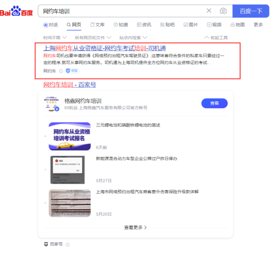 - 优化后效果:收录59个、500+关键词排名百度首页、上海全区的网约车考试、报名、流程、题库、地点词全线百度pc与移动首页。
