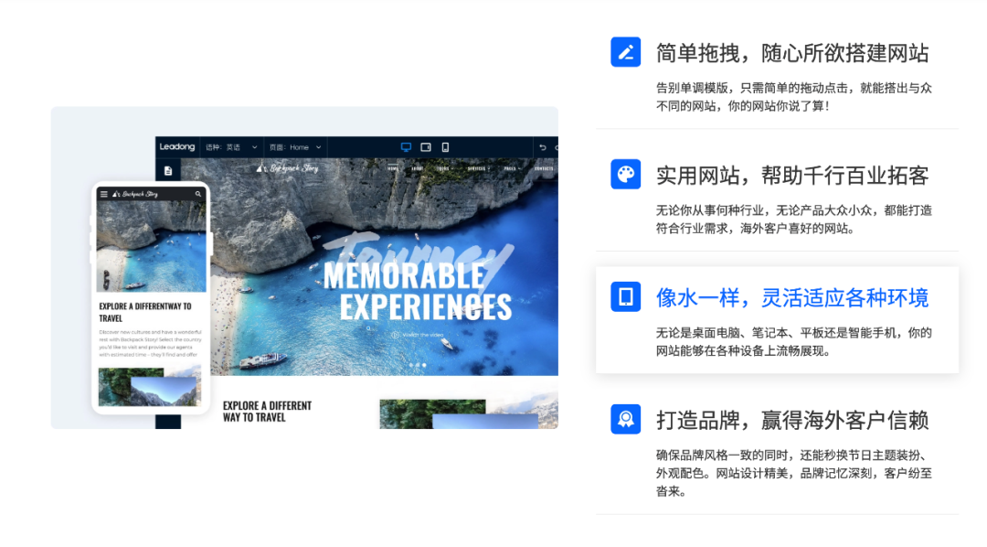领动独立站响应式设计,支持不同终端单独编辑。pc端、移动端既能共存又互不影响,做到了不同终端设计差异化、个性化的页面打造。