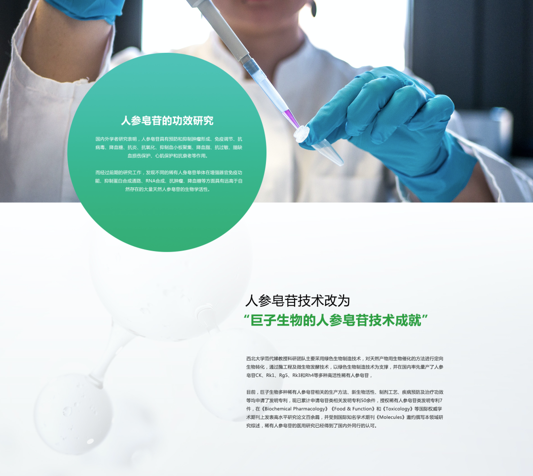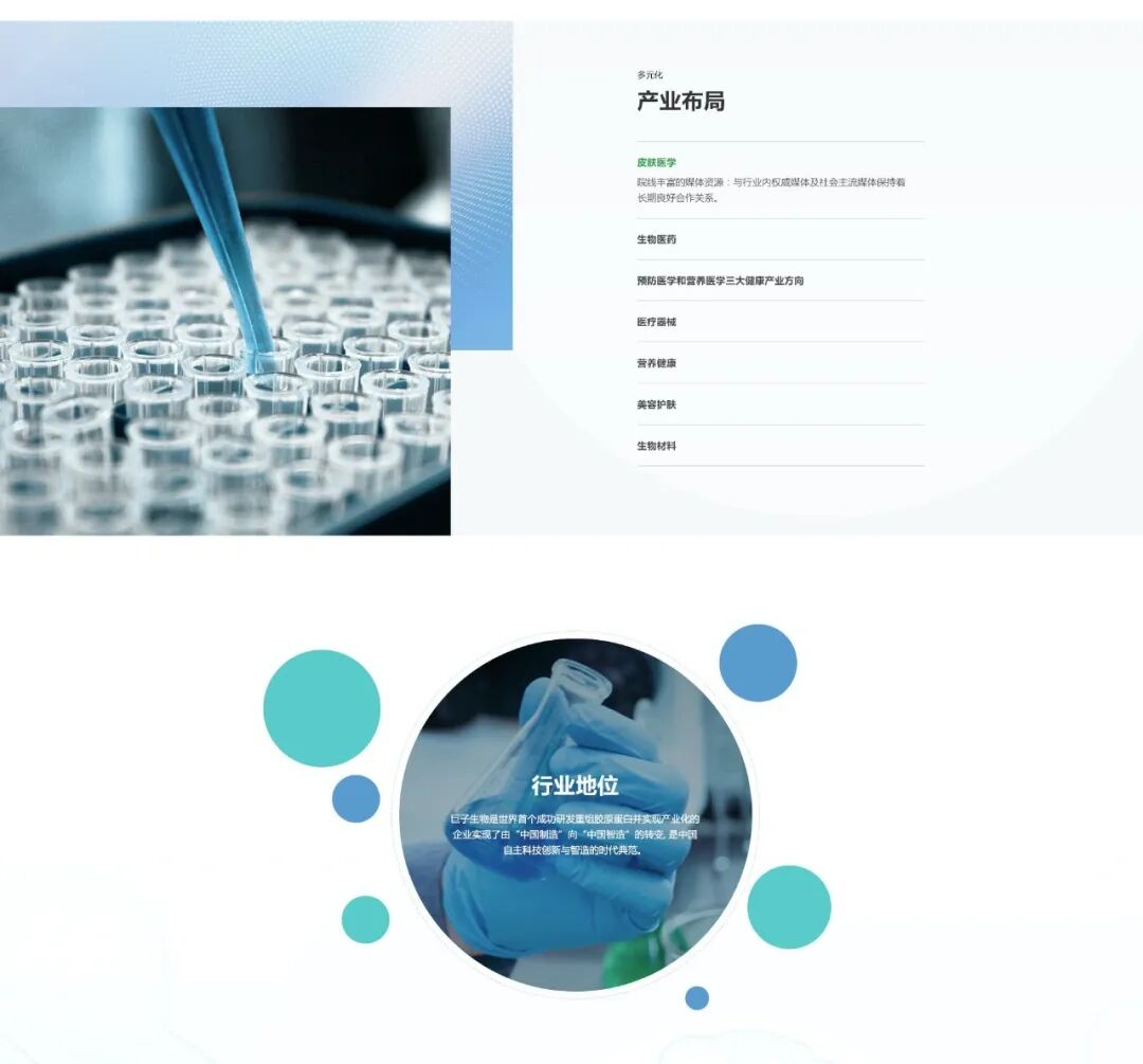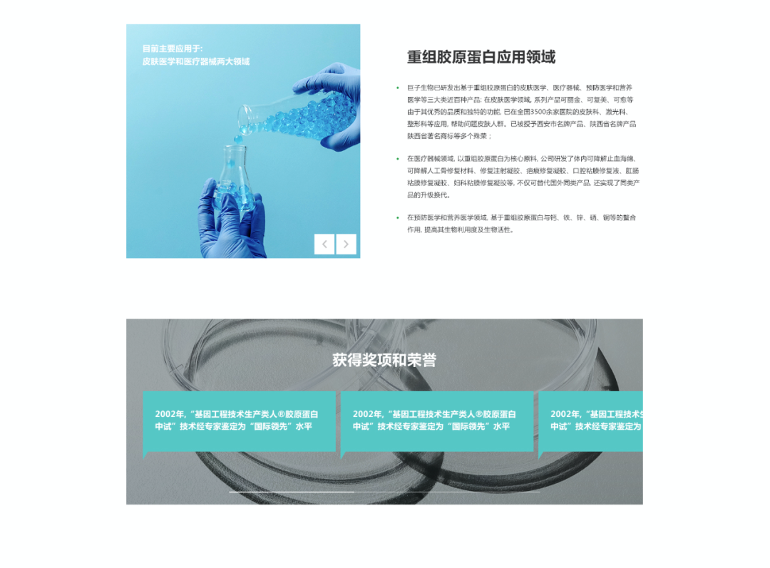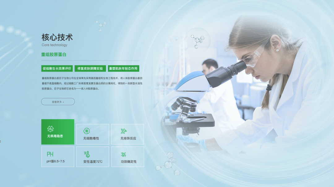 3)突出产品与技术,展示完整业务布局,有效凸显品牌实力,增强信任度;作为世界首个成果研发重组胶原蛋白护肤品并产业化的企业,更讲究技术和权威,通过呈现其技术的专业性、产品的有效性,凸显企业竞争力,提升用户说服力。通过实验室和技术团队,有效展示巨子生物独有的“合成生物学技术平台”,及生产出的重组胶原蛋白、稀有人参皂苷,在医美领域的行业领先性。