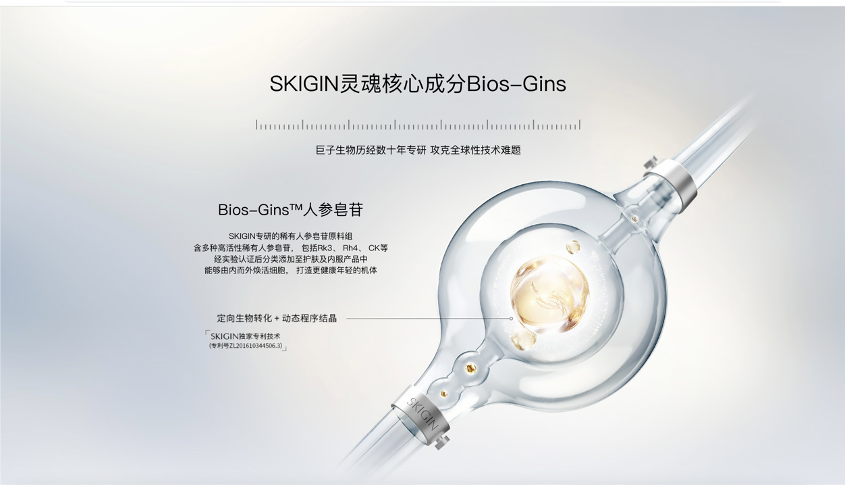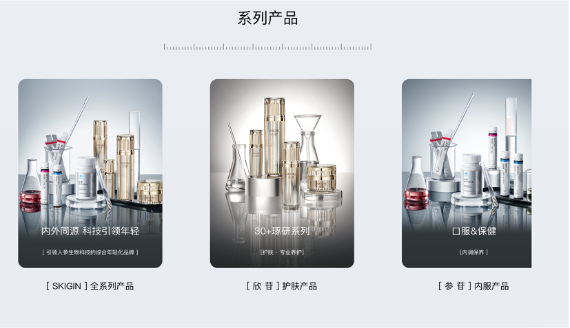 2) 其他产品,“可丽金”、“SKIGIN”等系列,受产品本身的设计调性,各自拥有不同的设计风格与背景氛围,设计师将产品风格与网站风格有效融合,强化产品技术实力与研发投入,打造新国货品牌高度。