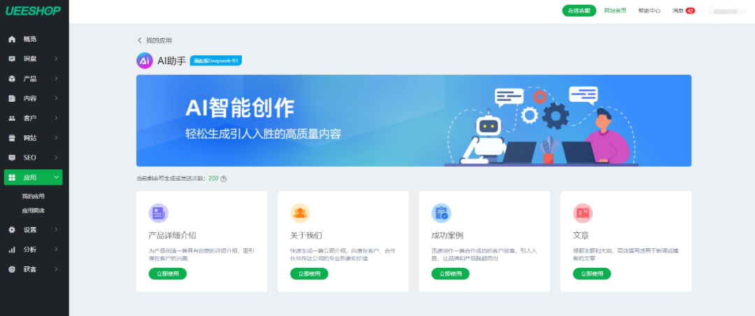 Ueeshop AI助手功能,可根据卖家输入的基础信息,快速生成高质量、吸引人眼球的产品详细介绍、关于我们、客户案例以及文章,这能够帮助卖家在提升运营效果的基础上,提高工作效率。