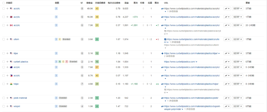 (来源:similarweb)关键词:根据ahrefs数据显示,Curbell Plastics的自然搜索关键词,最大的特点就是涉及多个塑料材料领域,不仅包括常见的塑料类型,还涵盖了多种特殊材料。
