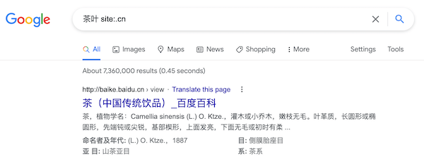 通常,当你使用谷歌搜索时,搜索结果会受到IP所在的国家/地区影响。例如,如果你在印度,则会将你的访问定向到Google.co.in,而不是Google.com。如果你想排除地域的影响,可以访问google.com/ncr这个网址,其中的NCR代表没有国家/地区重定向。上面我们讲过site:这个指令,可以限定在某个网站内查询,而这个搜索指令同样可以限定查询某个域名类型的网站。比如,我们想查找关于茶叶的.cn域名的网站。输入搜索指令:茶叶 site:.cn