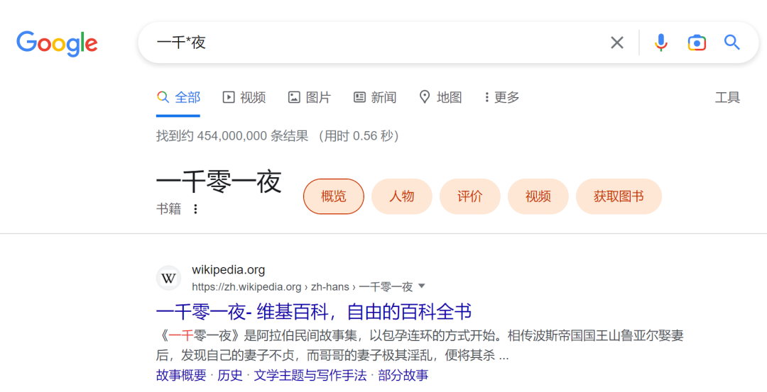 如果你想要搜索一个词组,但又记不起完整的内容了,就可以使用联想查询方法。谷歌会自动帮你联想出缺少的部分,常被用来查找标题类的信息,比如书名、歌曲名称等。比如,我们想要查找一千零一夜童话,但只记得一千和最后的夜字。输入搜索指令:一千*夜