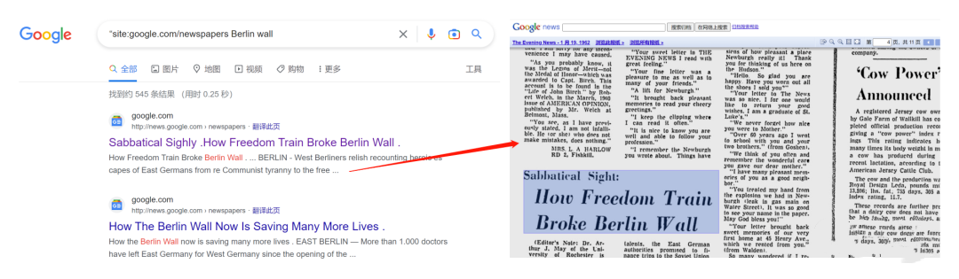 谷歌可以为你提供过去几年的数字化新闻内容。它扫描并数字化了旧印刷报纸,试图让互联网用户可以轻松获取旧报纸的内容。例如,输入“site:google.com/newspapers Berlin wall”查询主题为“柏林墙”的报道。